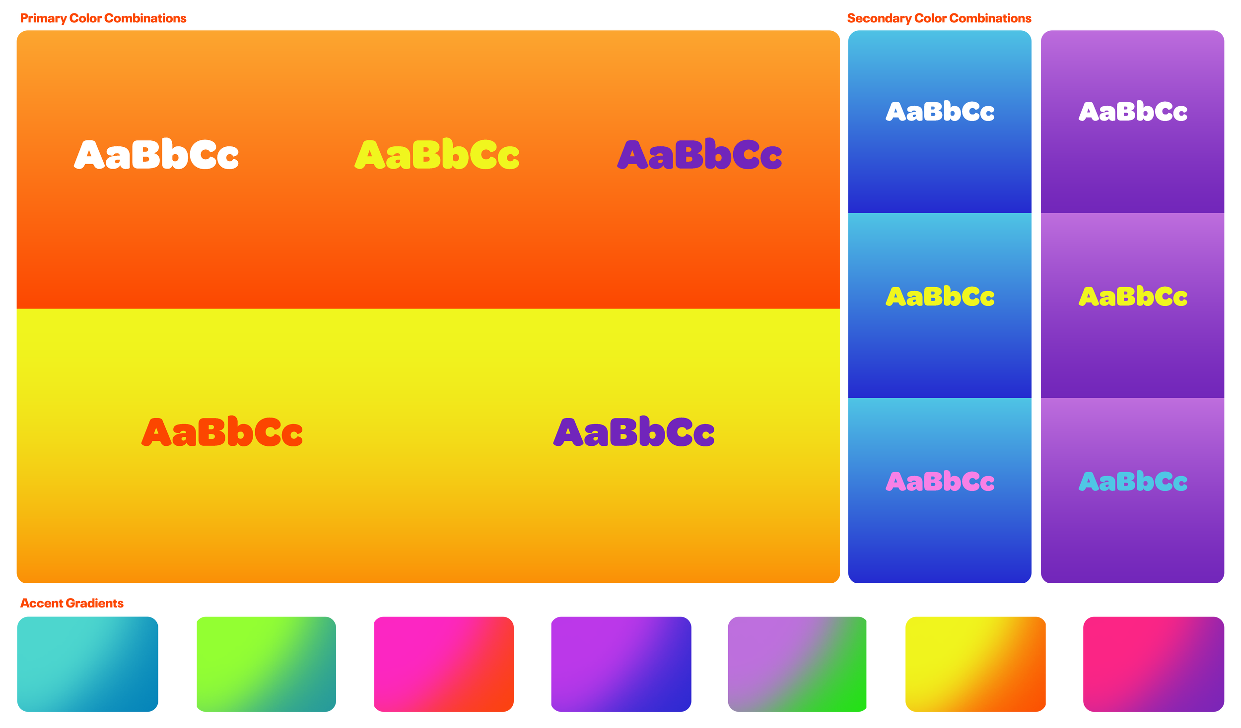 Nick Jr.’s system begins with a warm, preschool-first palette built around its iconic orange and yellow. Accent colors were expanded from Nickelodeon’s splat world, creating consistency with the parent brand while keeping a softer preschool tone.